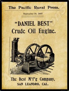 1897 Daniel Best Oil Engine Collectible Metal Sign: San Leandro, California