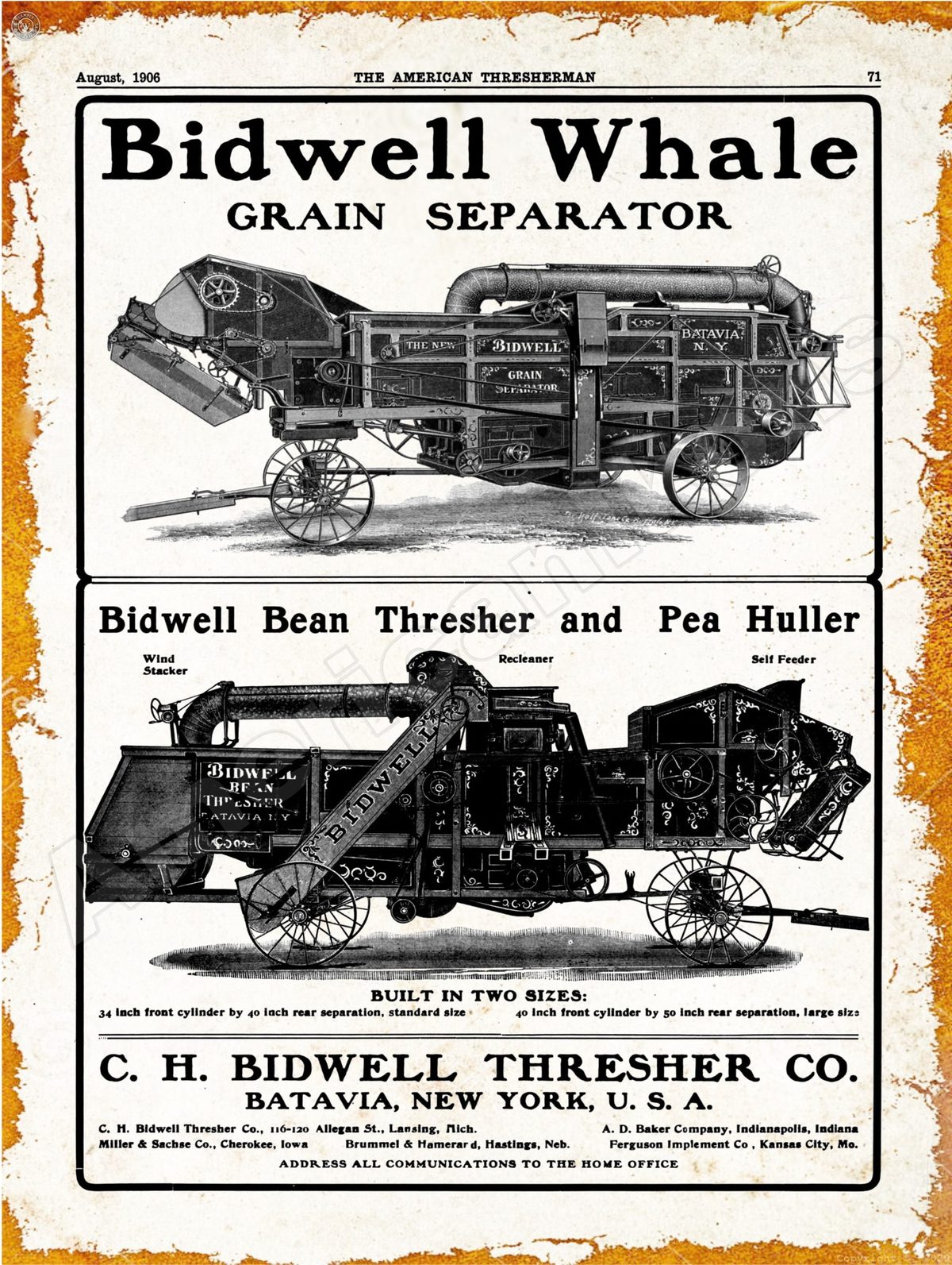 1906 Bidwell Thresher Company Collectible New Metal Sign: Batavia, New York
