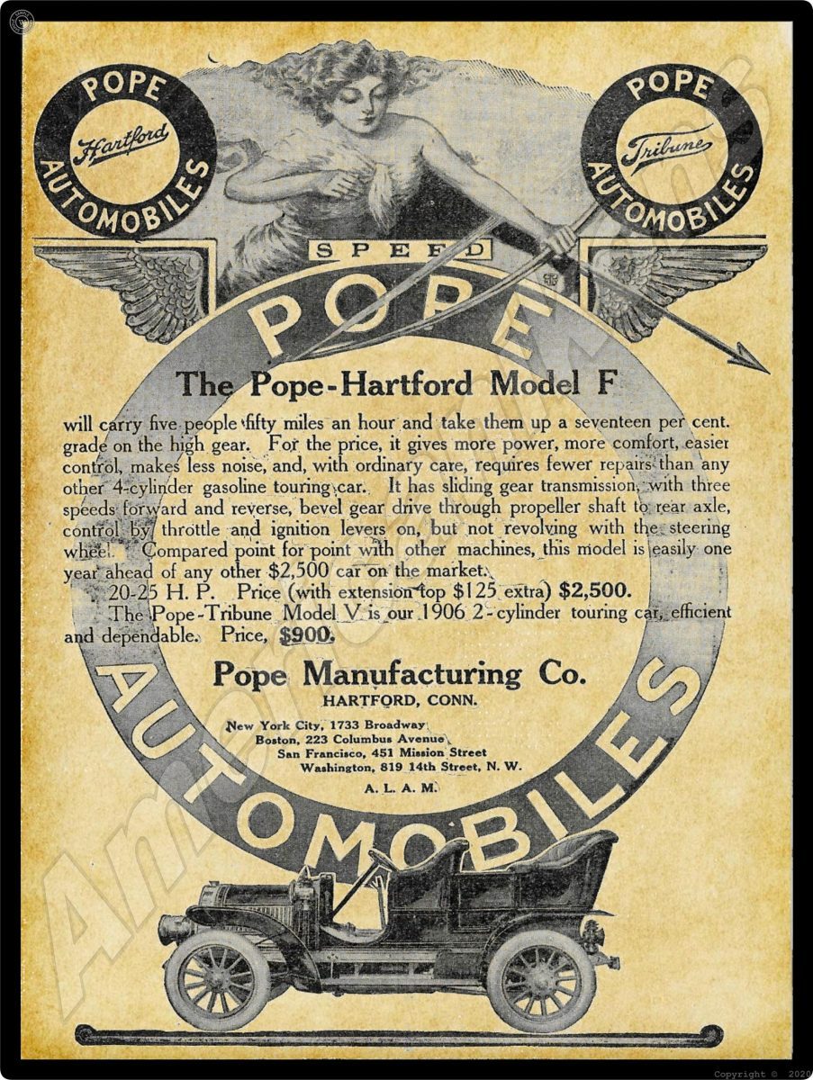 1906 Pope Automobiles Collectible Metal Sign: Hartford, Connecticut