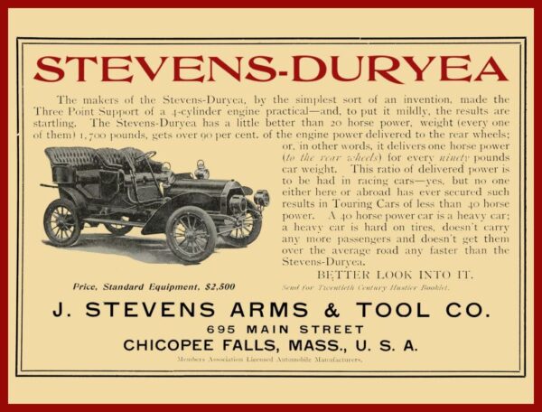 1906 Stevens Duryea Motor Car Collectible NEW Metal Sign: J. Stevens Arms & Tool Company – Chicopee Falls, Massachusetts