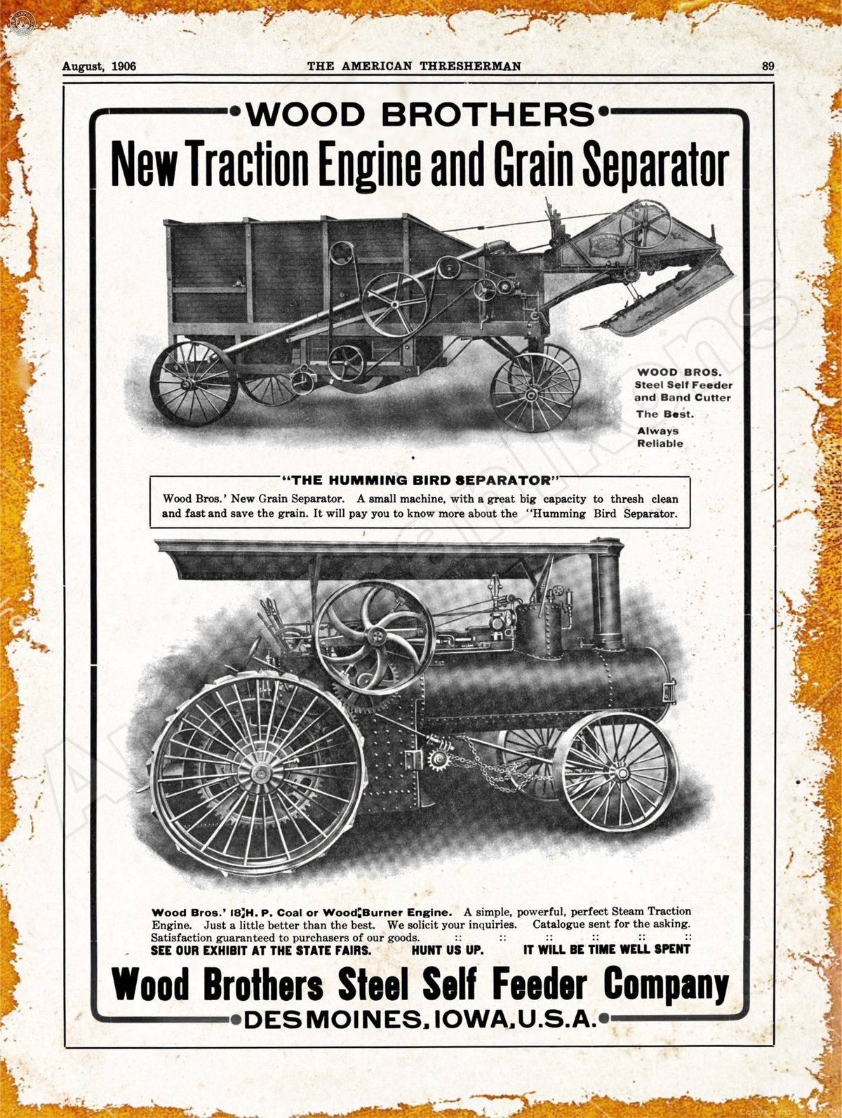 Tags: collectible, des moines iowa, grain separator, metal sign, wood brothers traction engine