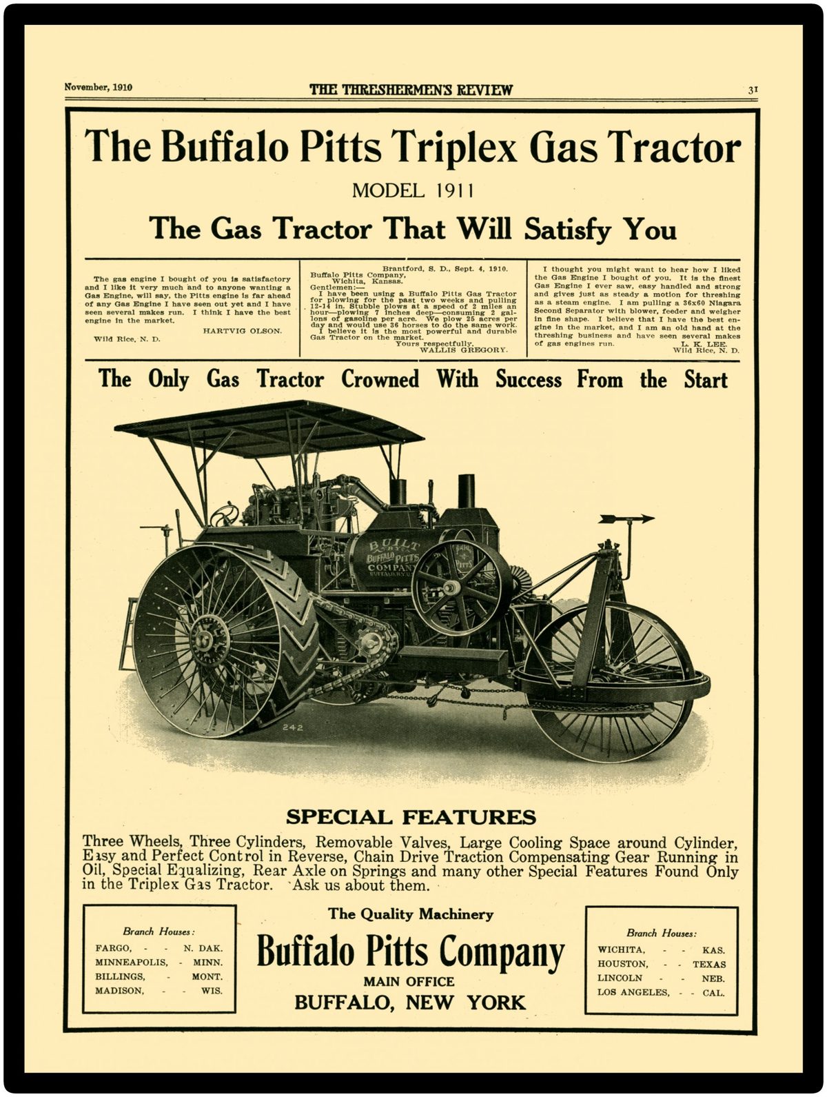 1910 Buffalo Pitts Company Collectible New Metal Sign: Triplex Gas Tractor Model 1911