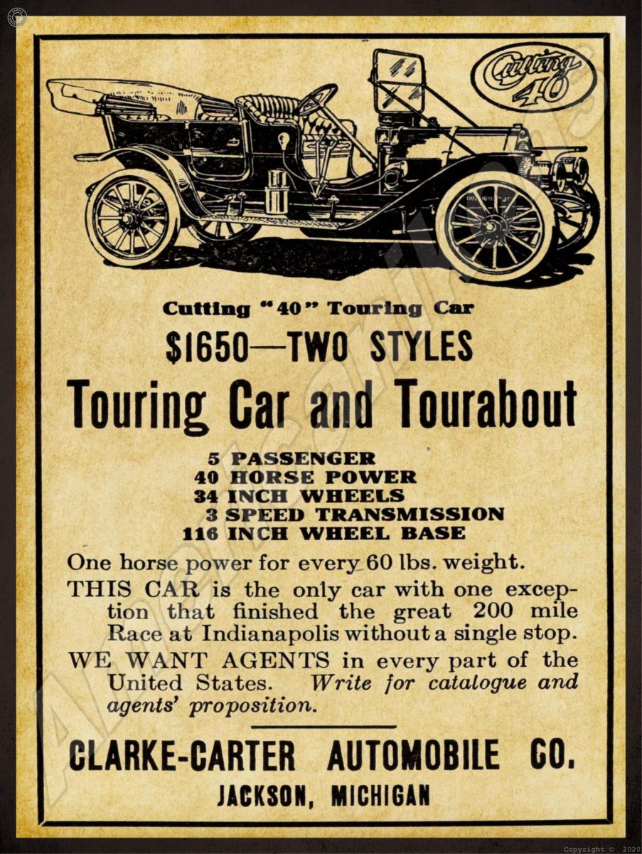 1911 Clarke Carter Cutting 40 Motor Car Collectible Metal Sign: Jackson, Michigan