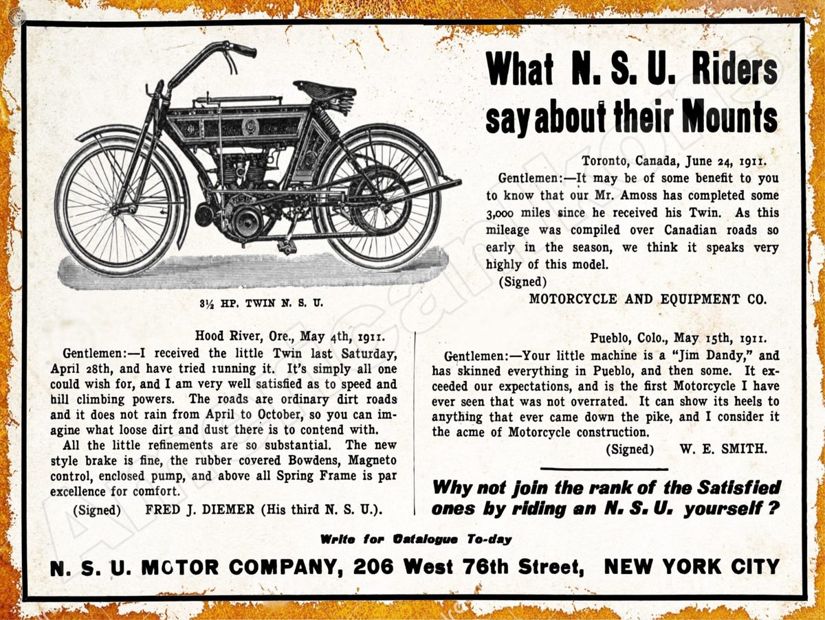 1911 NSU Motorcycles Collectible Metal Sign: New York City