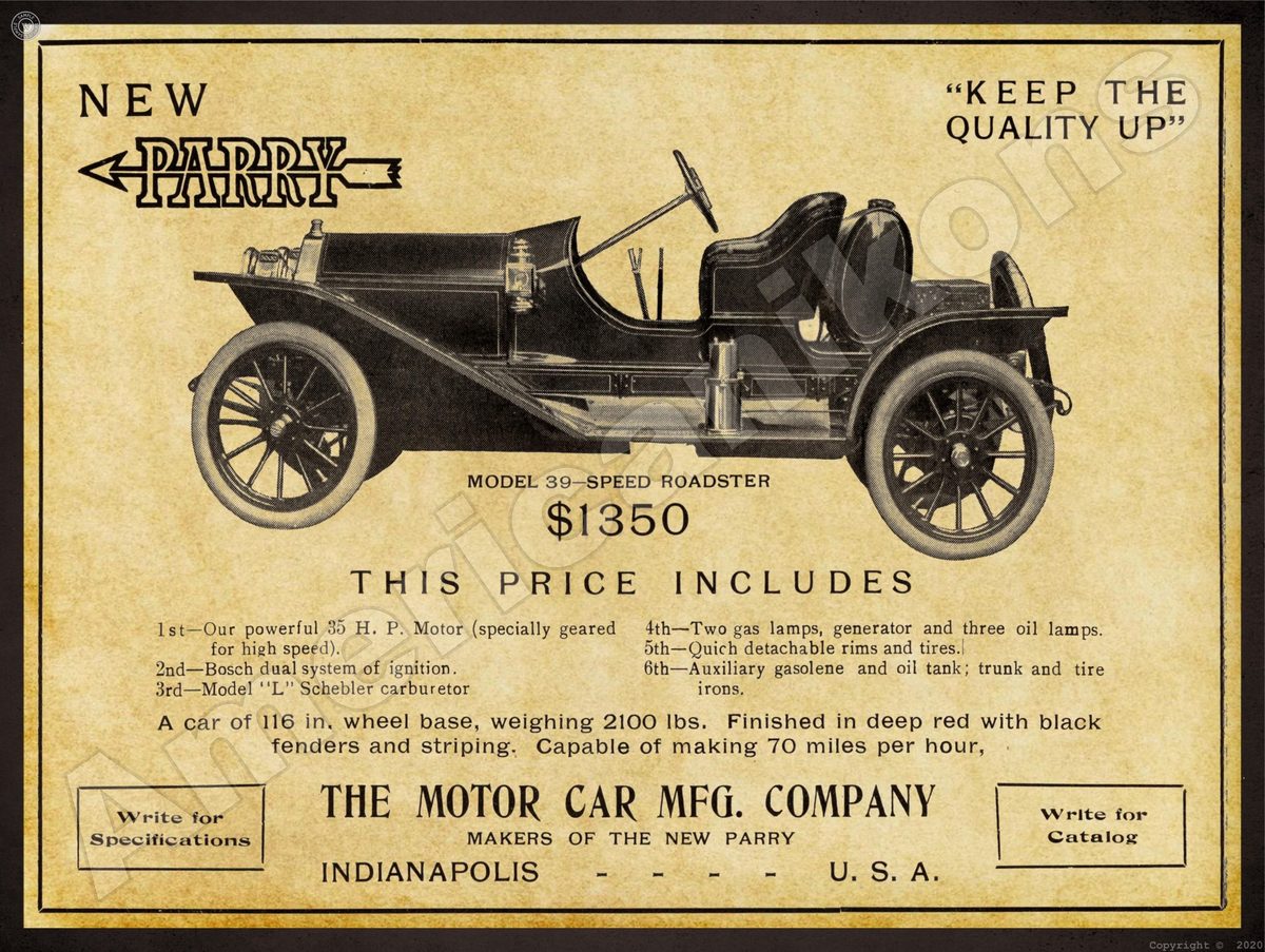 1911 Parry Motor Cars Collectible Metal Sign: Model 39 Speed Roadster – Motor Car Mfg. Company – Indianapolis, Indiana