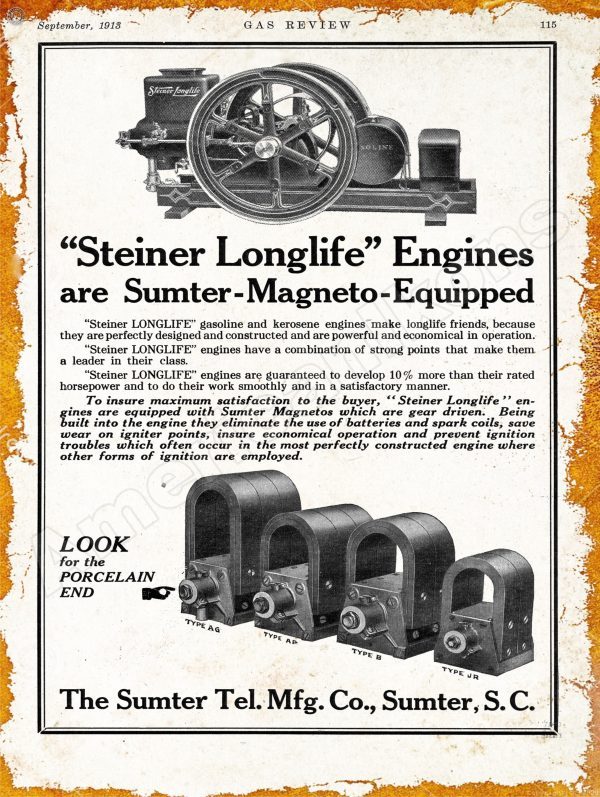 1913 Sumter Magneto Collectible Metal Sign: Featured in Steiner Longlife Gas Engines
