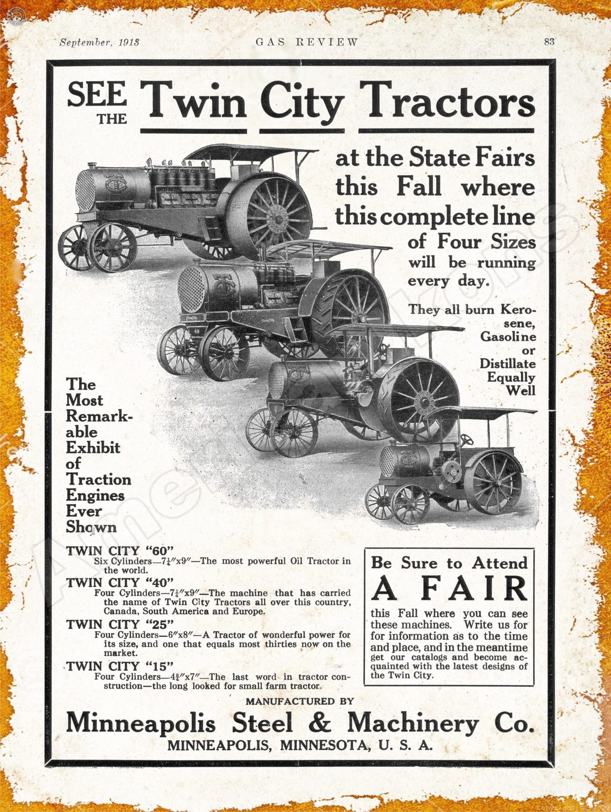 1913 Twin City Tractors Collectible New Metal Sign: By Minneapolis Steel & Machinery Company