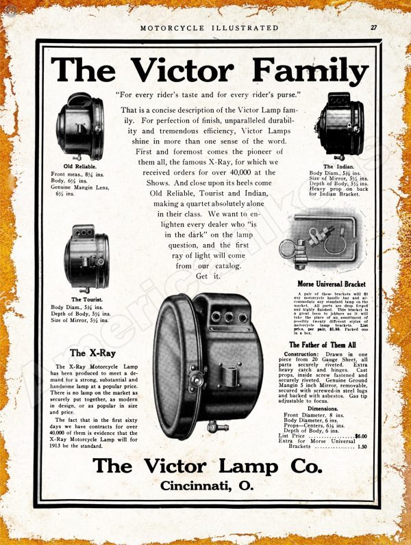 1913 Victor Lamp Company Motorcycle Headlight Collectible New Metal Sign: Cincinnati, Ohio