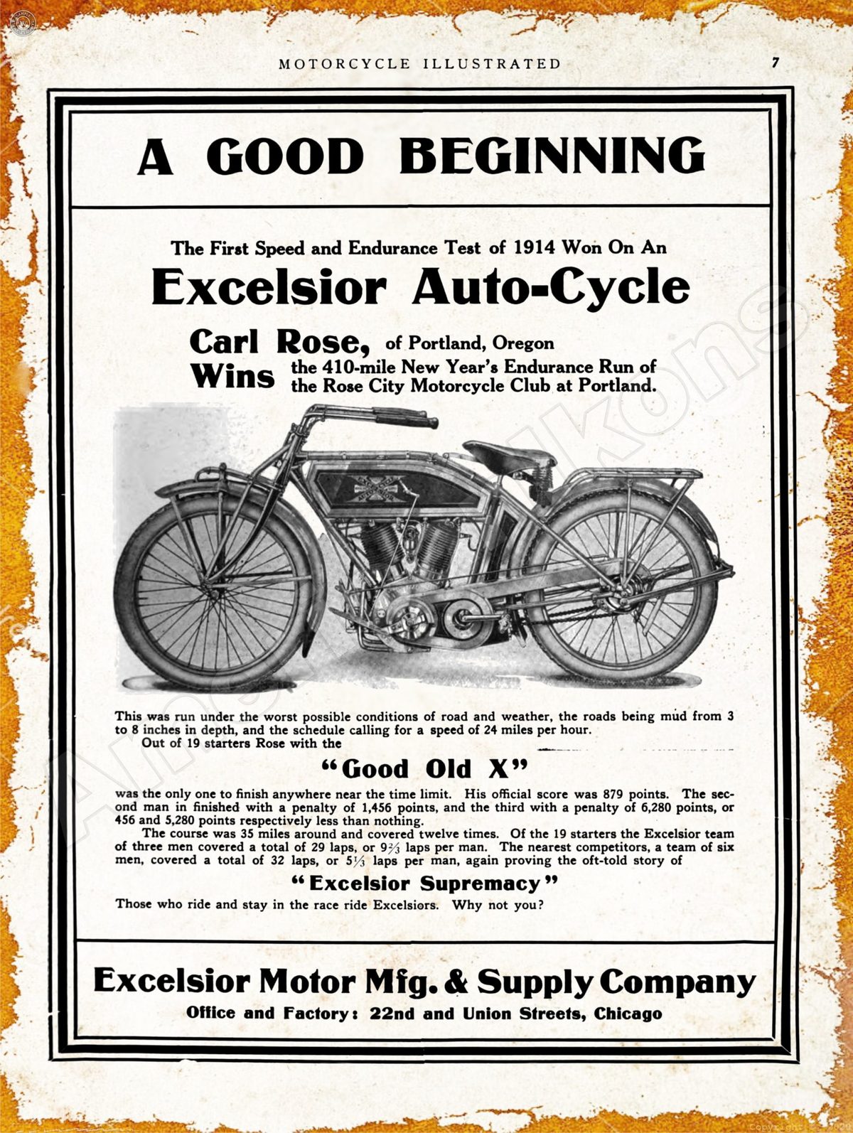 1914 Excelsior Motorcycles, Autocycles Collectible New Metal Sign: Chicago, Illinois