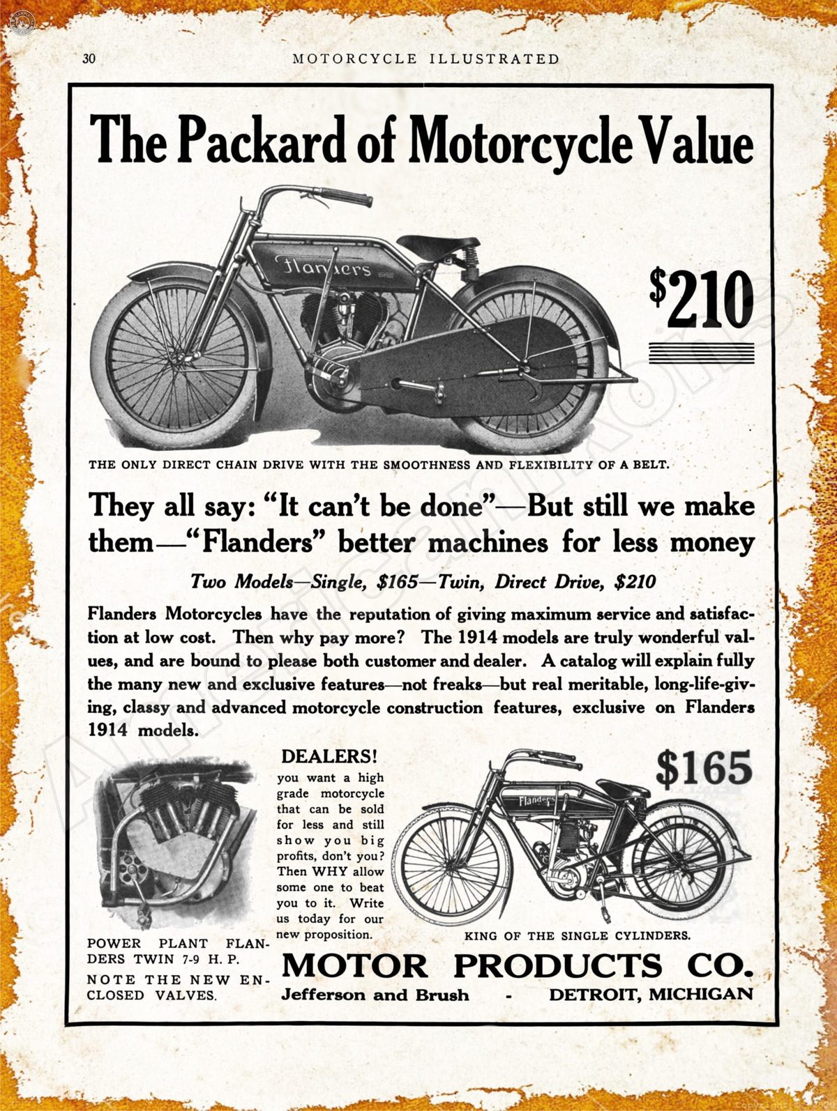 1914 Flanders Motorcycles Collectible New Metal Sign: The Packard of Motorcycles!