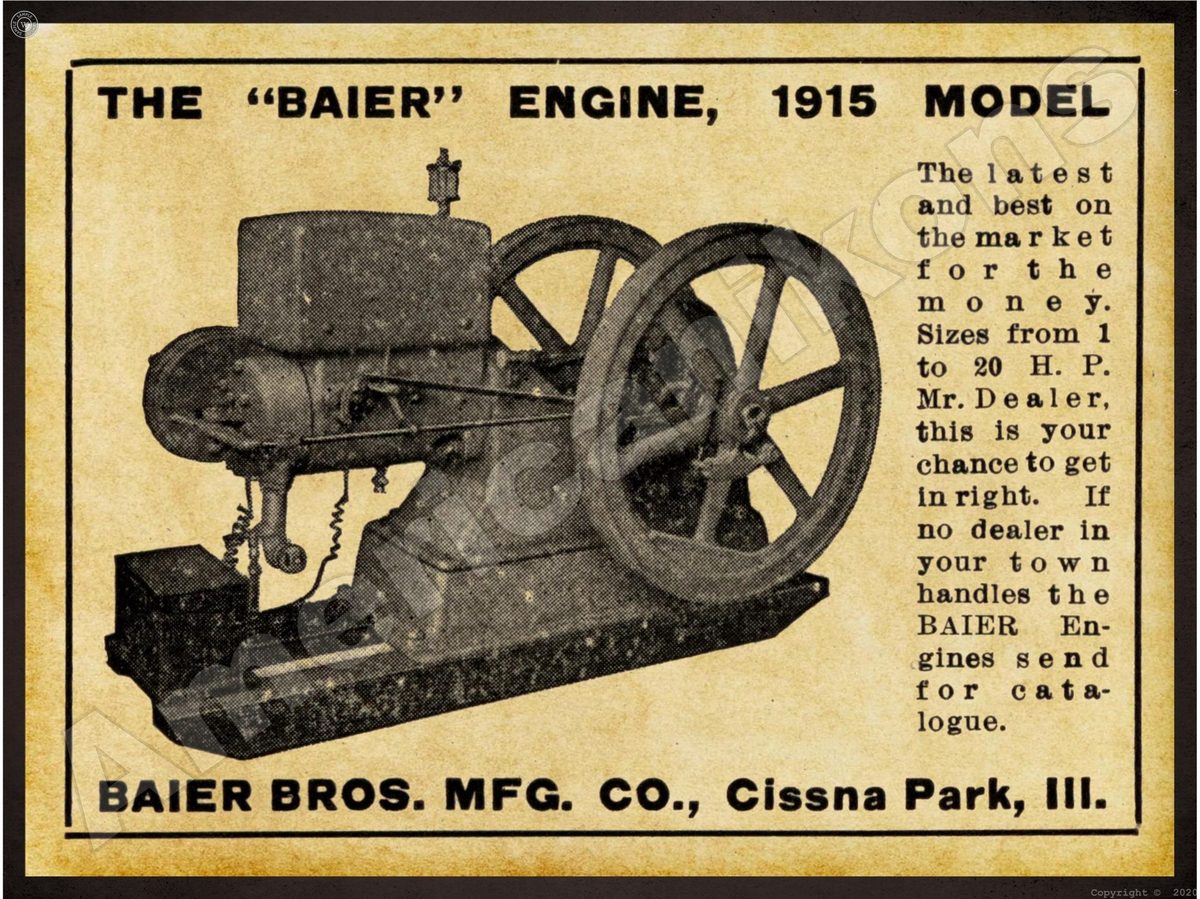 1915 Baier Brothers Gas Engines Collectible Metal Sign: Cissna Park, Illinois