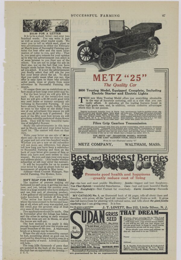 1915 Metz Automobiles Collectible Advertisement: Touring Model – Waltham, Massachusetts