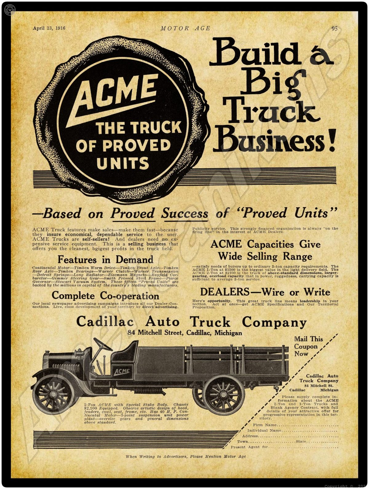 1916 Cadillac Auto Truck Company Collectible Metal Sign: ACME Trucks of Cadillac, Michigan