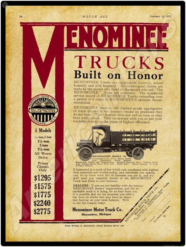 1917 Menominee Trucks Collectible Metal Sign: Menominee, Michigan