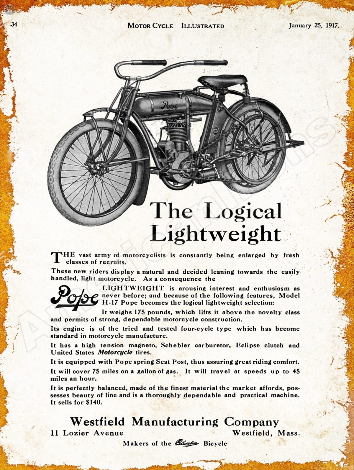 1917 Pope Motorcycles Collectible New Metal Sign: Westfield, Massachusetts