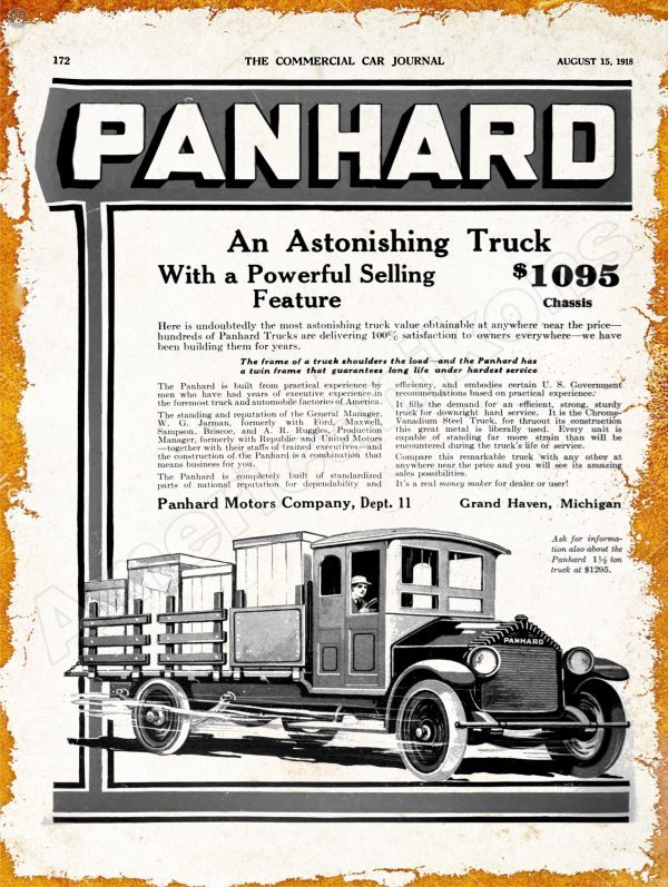 1918 Panhard Motor Trucks Collectible New Metal Sign: Grand Haven, Michigan