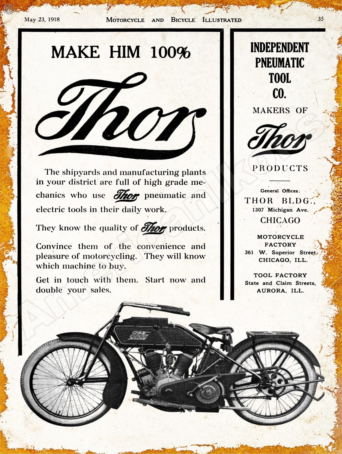 1918 Thor Motorcycles Collectible New Metal Sign: Chicago, Illinois