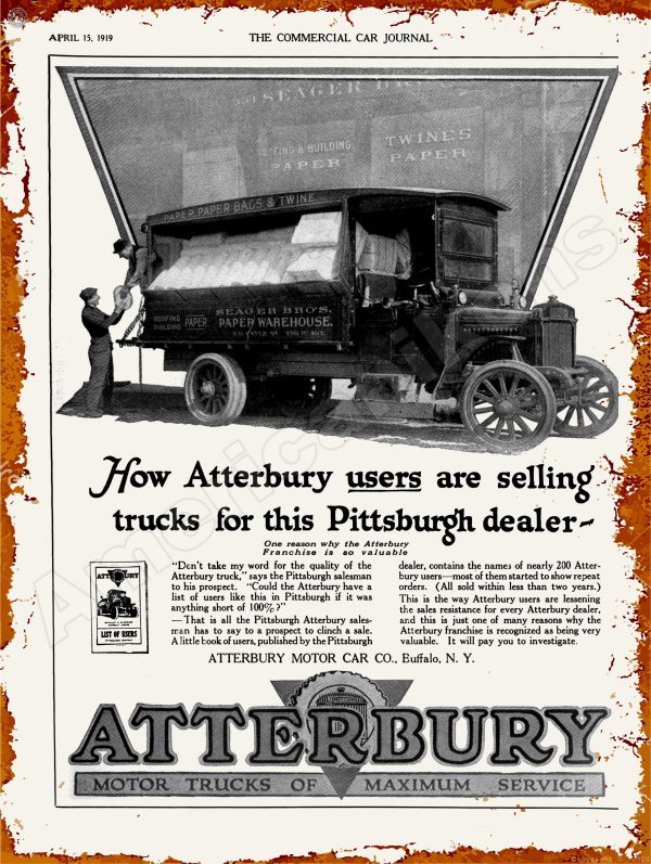 1919 Atterbury Trucks Collectible New Metal Sign: Buffalo, New York + Pittsburgh Dealership