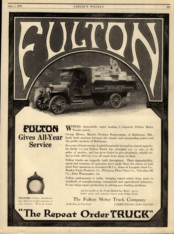 1919 Fulton Motor Truck Company Collectible Advertisement: Farmingdale, Long Island New York