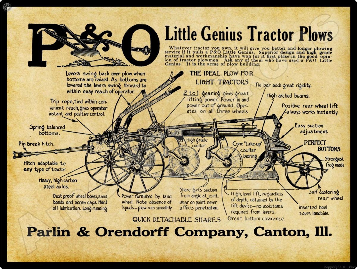 1919 P & O Little Genius Tractor Plows Collectible Metal Sign: Parlin & Orendorff Company – Canton, Illinois