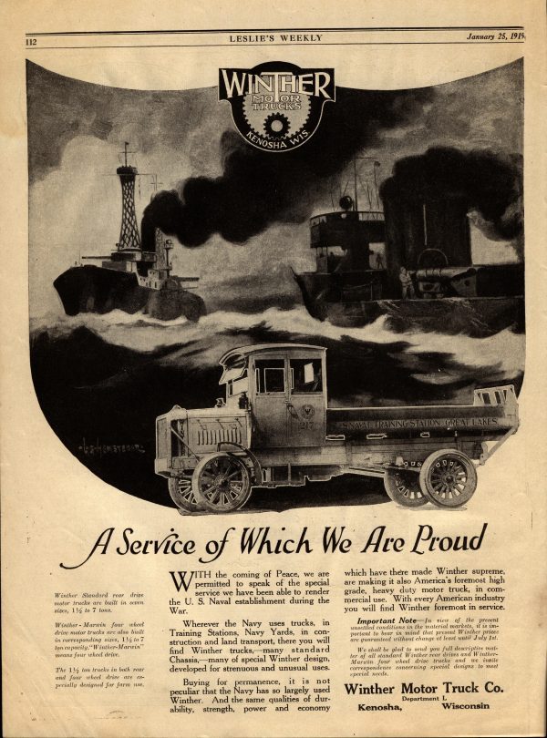 1919 Winther Motor Trucks at Great Lakes Naval Training Station Collectible Advertisement: Kenosha, Wisconsin