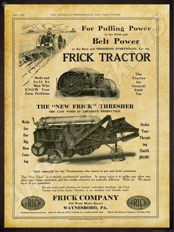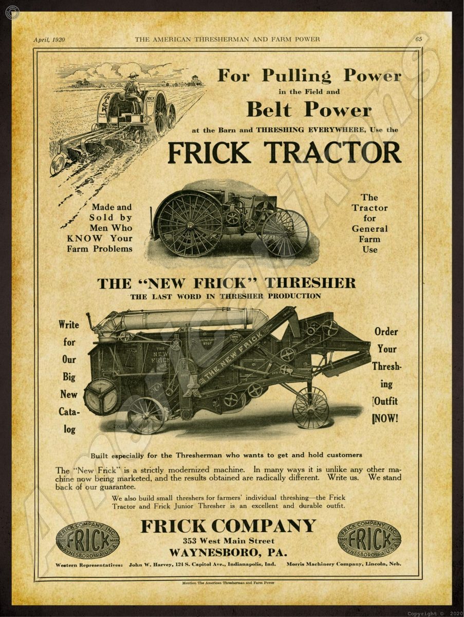 1920 Frick Tractor & Threshing Machine Collectible Metal Sign: Waynesboro, Pennsylvania