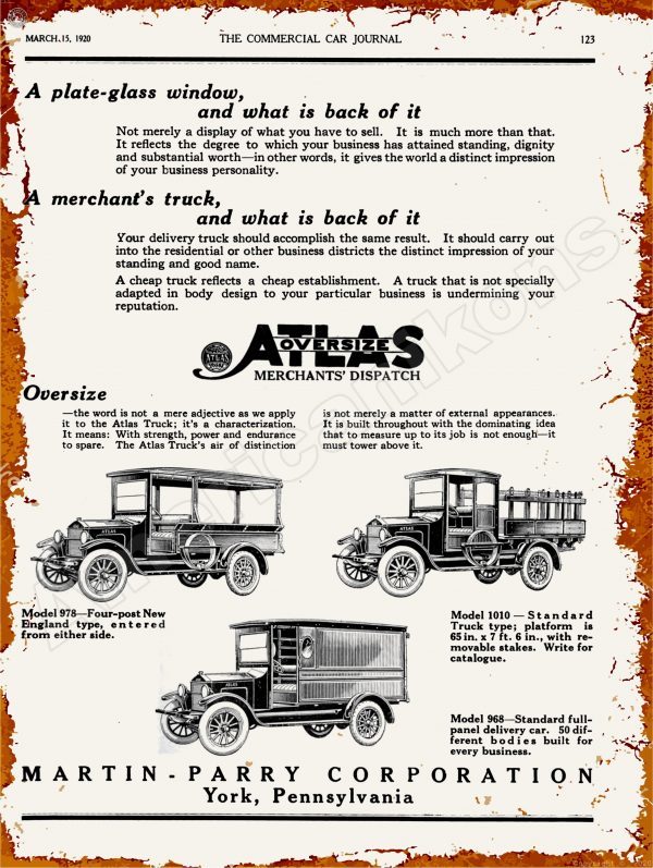 1920 Martin-Parry Atlas Trucks Collectible Metal Sign: York, Pennsylvania