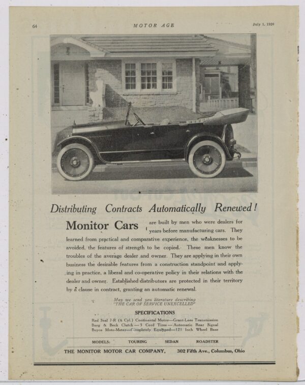 1920 Monitor Motor Car Company Collectible Advertisement: Columbus, OhiO