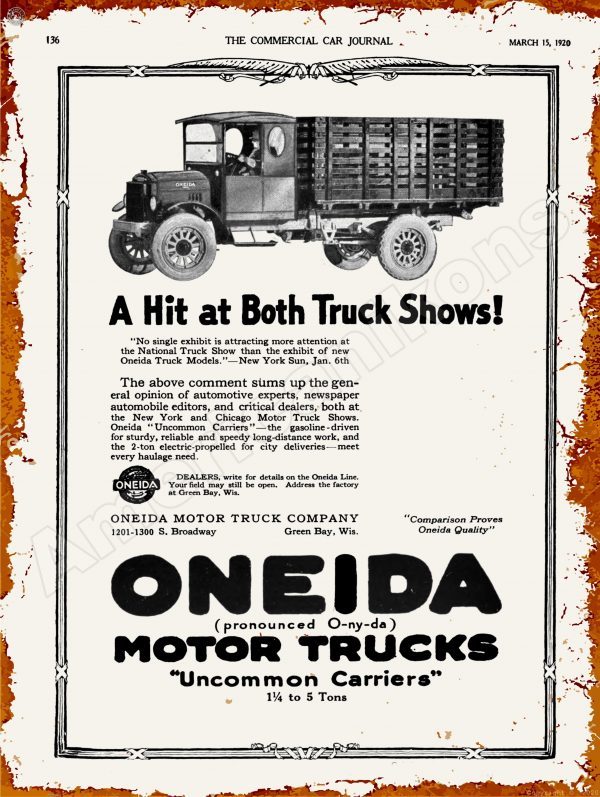 1920 Oneida Motor Trucks Collectible Metal Sign: Green Bay, Wisconsin