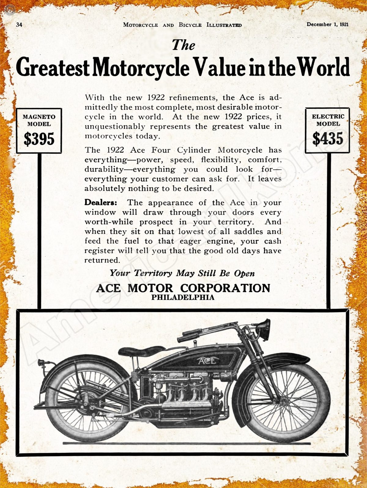 1921 Ace Motorcycles Collectible New Metal Sign: Philadelphia, Pennsylvania