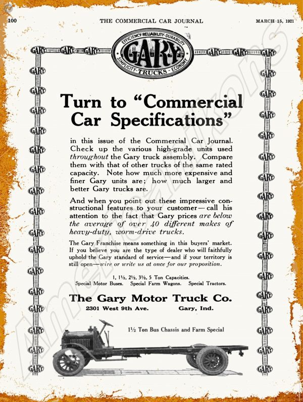 1921 Gary Motor Trucks Collectible Metal Sign: Gary, Indiana