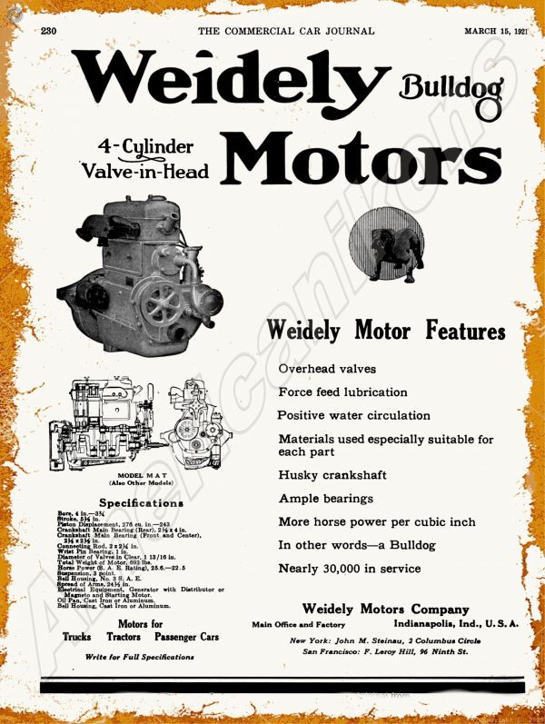 1921 Weidely Motors Collectible Metal Sign: Indianapolis, Indiana