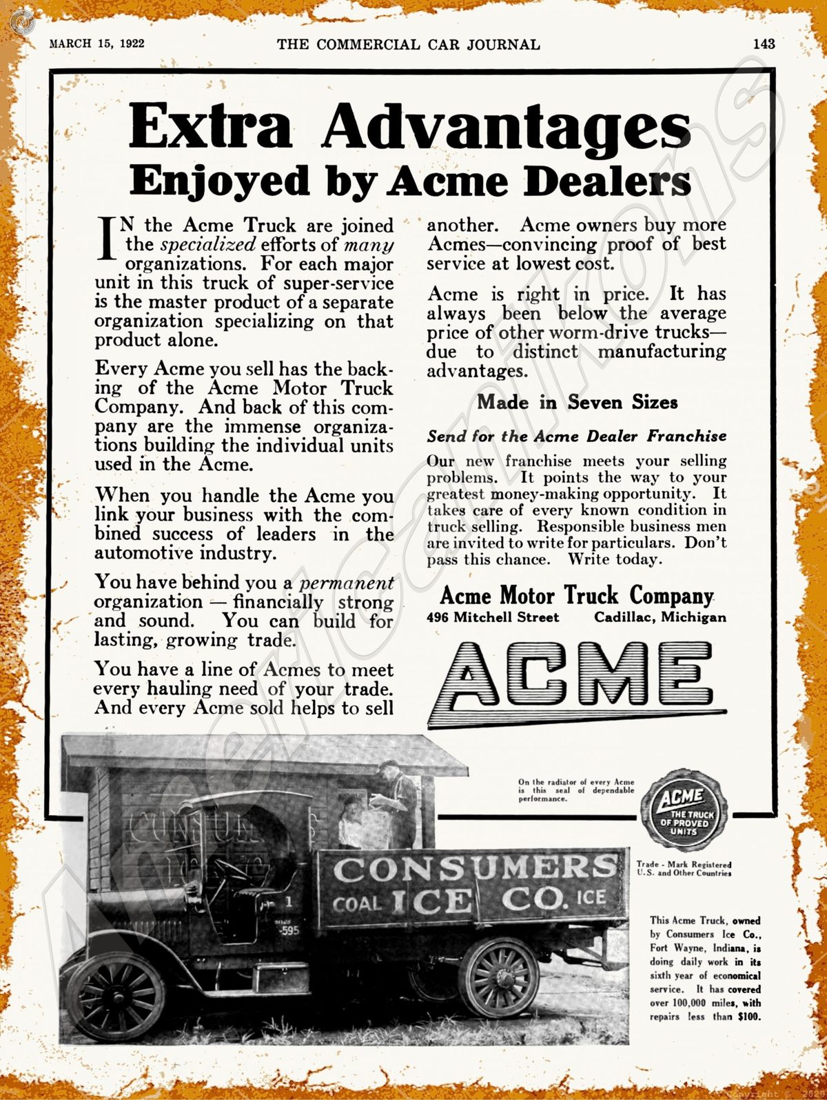 1922 ACME Trucks Collectible Metal Sign: Cadillac, Michigan