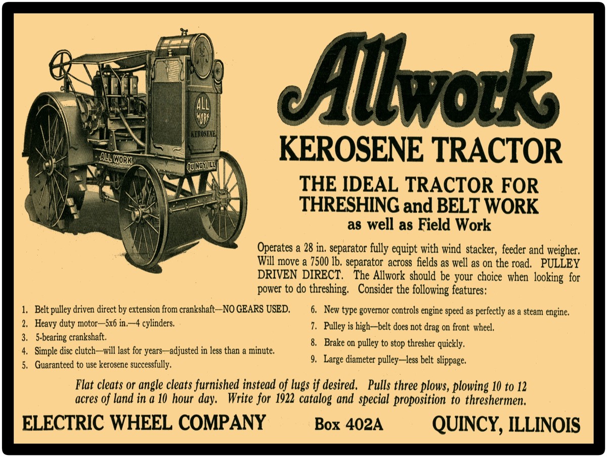 1922 Allwork Kerosene Tractor Reproduction Metal Sign: Electric Wheel Co, Quincy, Illinois