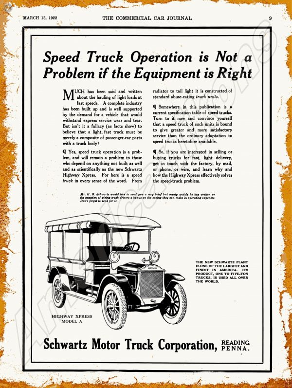 1922 Schwartz Motor Trucks Collectible Metal Sign: Reading, Pennsylvania