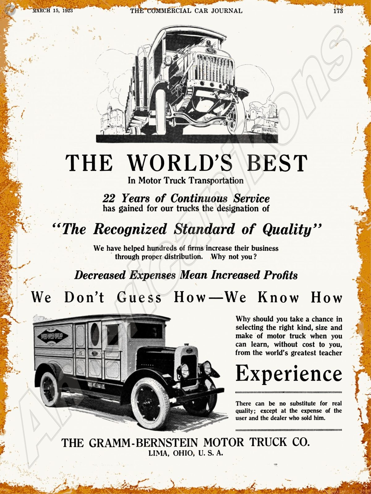 1923 Gramm Bernstein Trucks Collectible Metal Sign: Lima, Ohio
