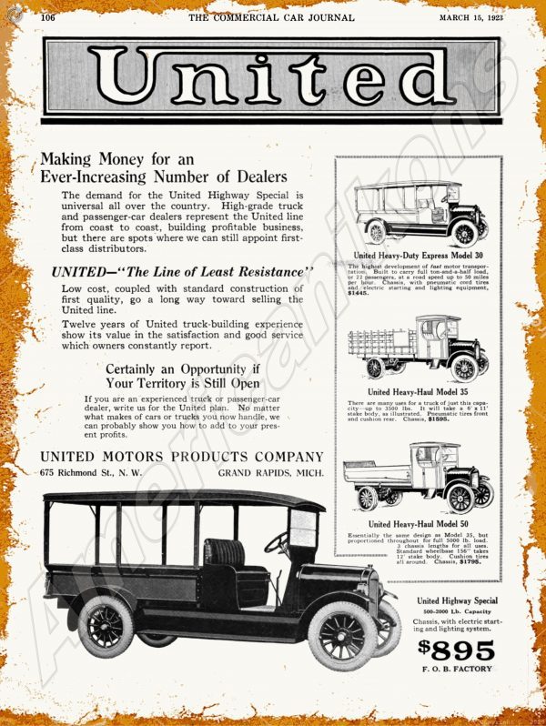 1923 United Motor Trucks Collectible Metal Sign: Grand Rapids, Michigan