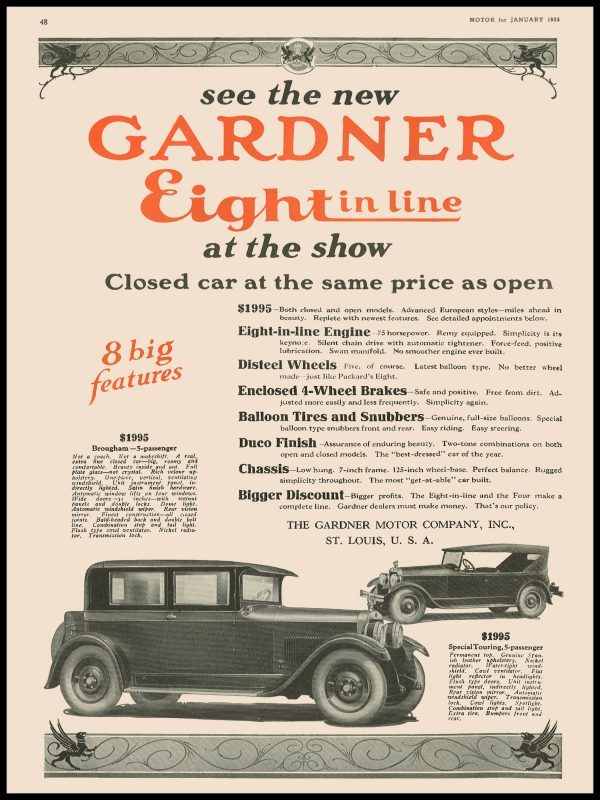 1925 Gardner Automobiles Collectible Metal Sign: Brougham & Special Touring – St. Louis, Missouri