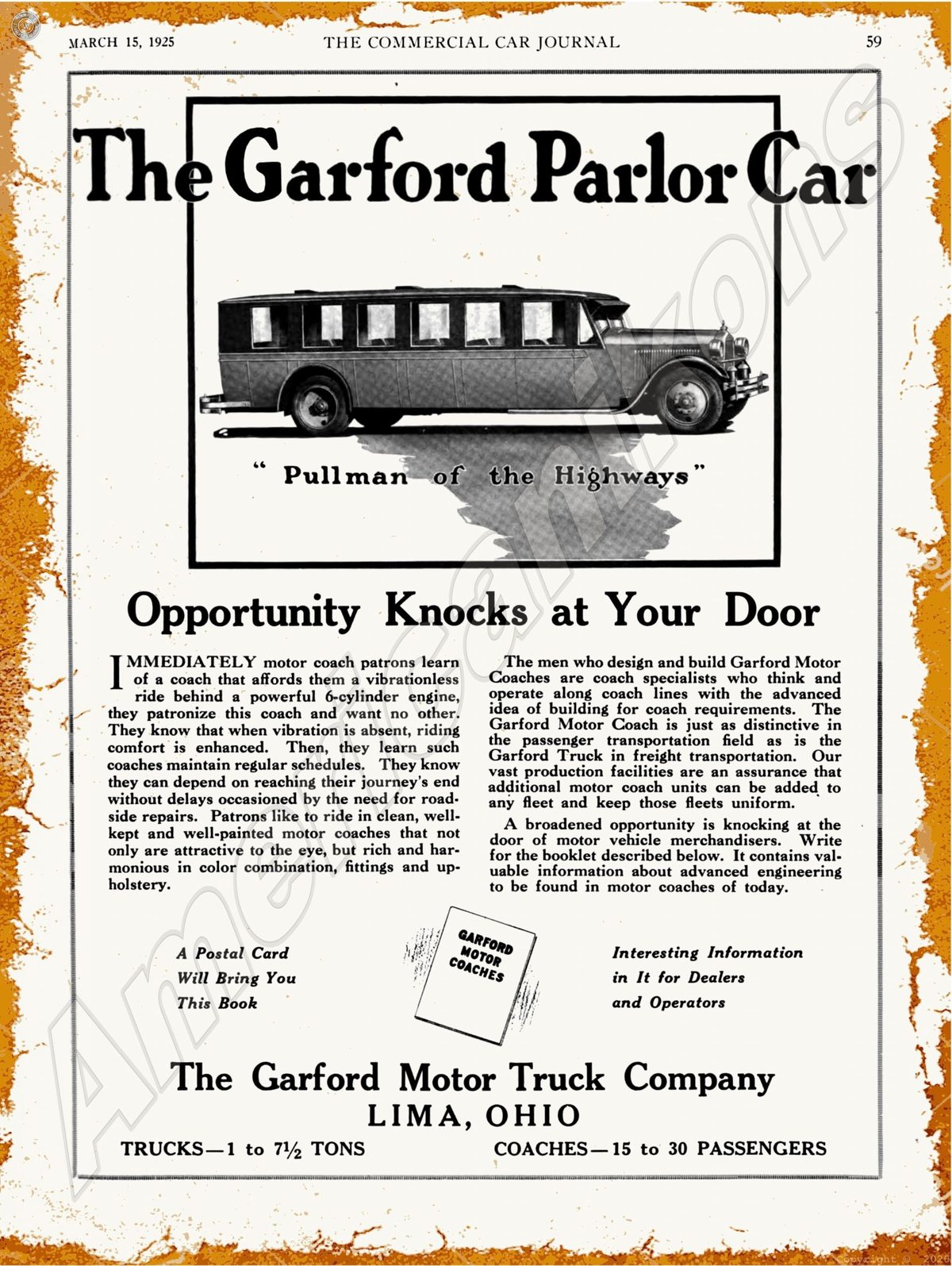 1925 Garford Motor Trucks Parlor Car Bus Collectible Metal Sign: Lima, Ohio