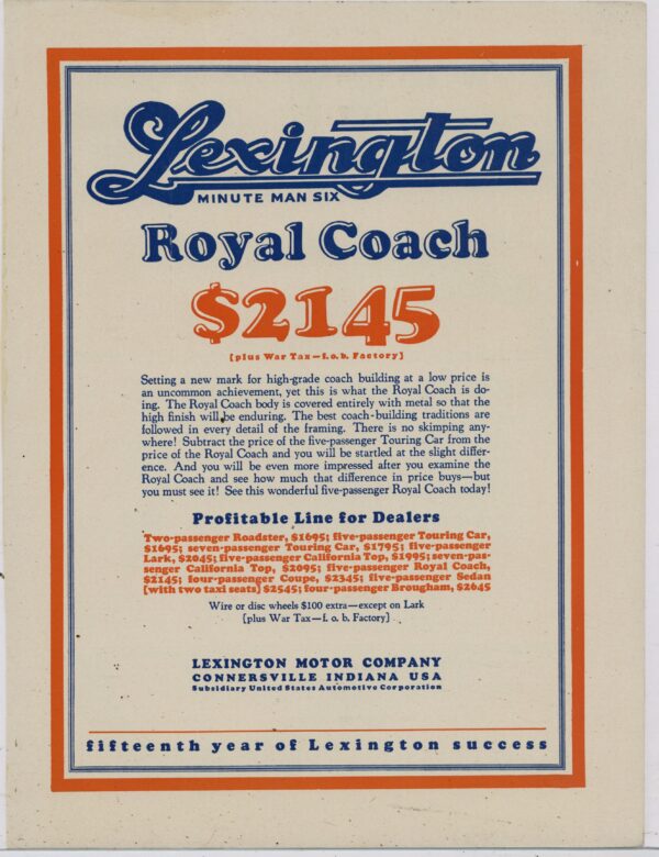 1925 Lexington Motor Company Collectible Advertisement: Minute Man Six Royal Coach – Connersville, Indiana