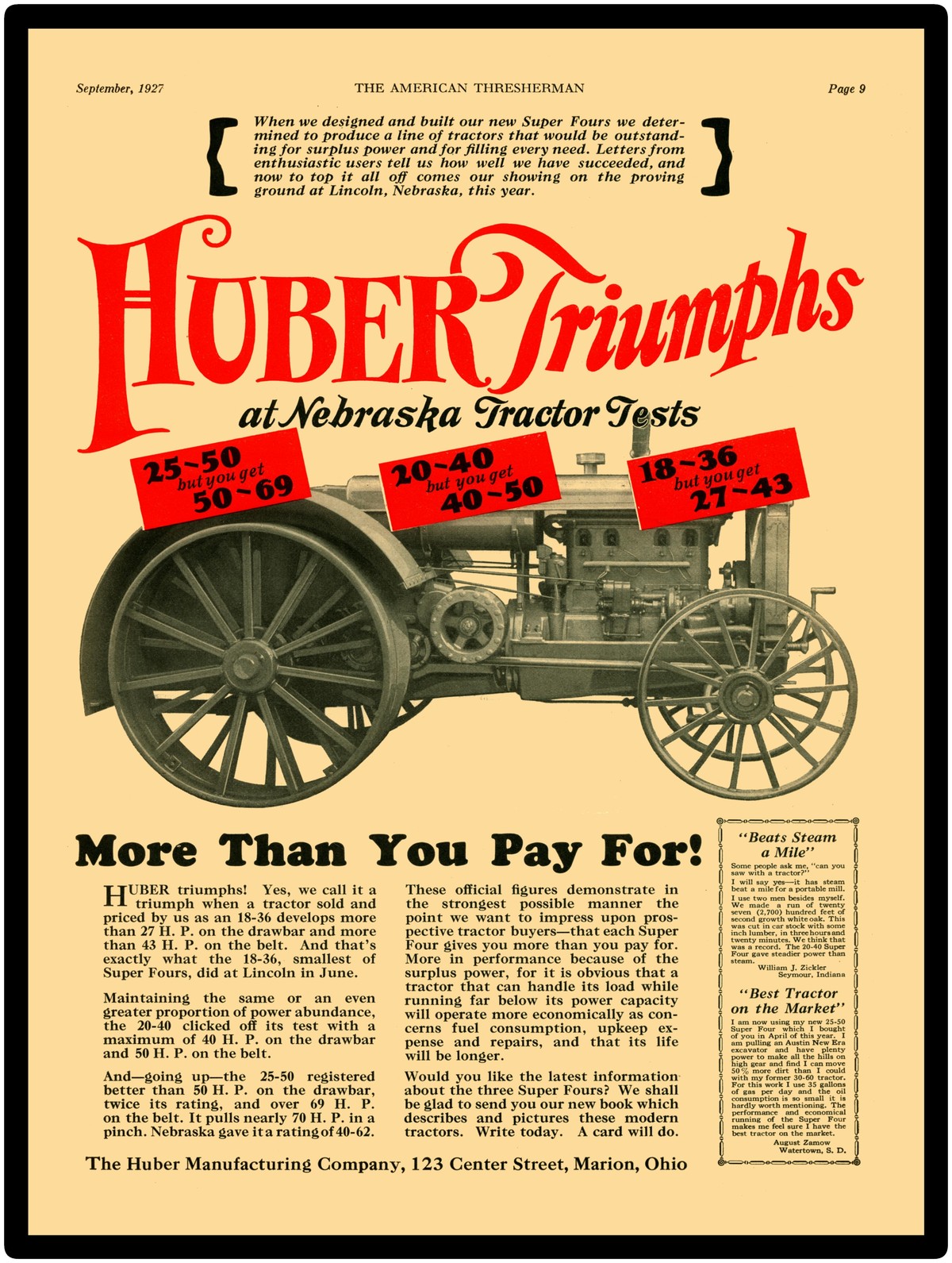 1927 Huber Super Four 4 Tractor, Model 18-36 Reproduction Metal Sign: Nebraska Tractor Trials
