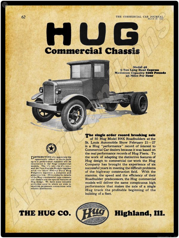 1927 Hug Trucks Collectible Metal Sign: Highland, Illinois