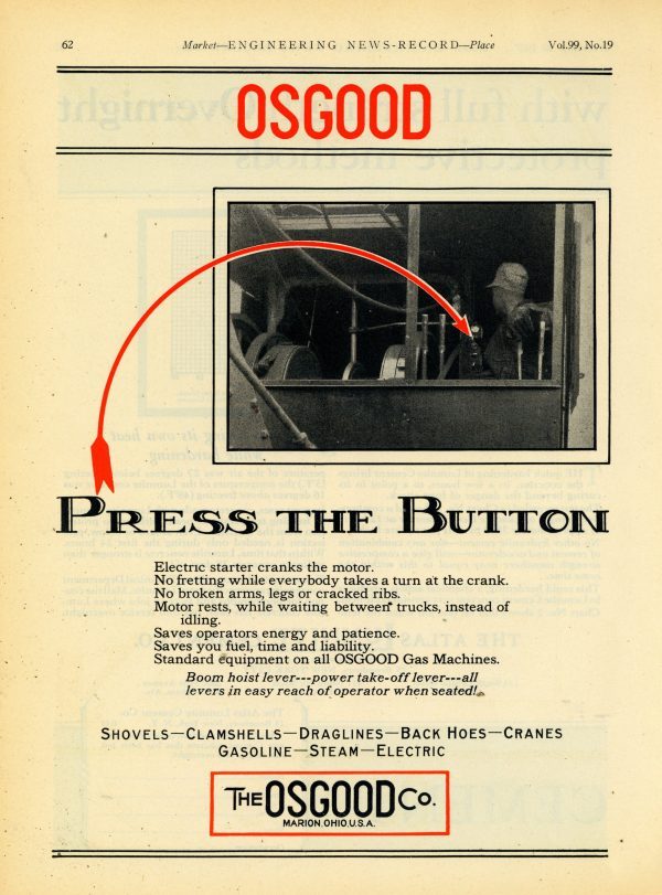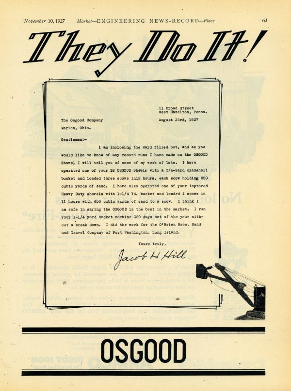 1927 Osgood Shovel 2 Page Ad: Marion, Ohio – Clamshell Dragline, Back Hoe, Crane