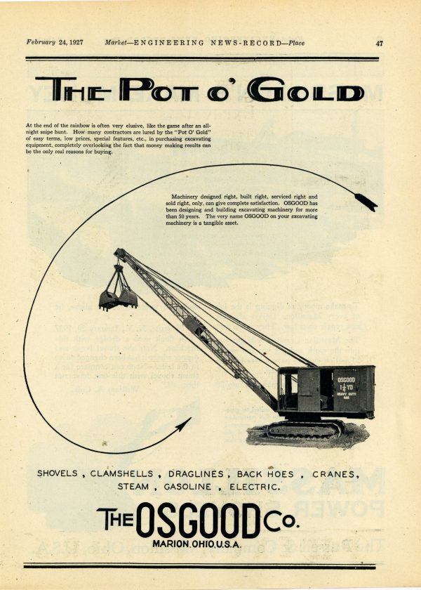 1927 Osgood Shovel Ad: Marion, Ohio – Clamshell Dragline, Back Hoe, Crane