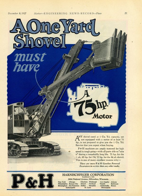 1927 P & H Model 600 Excavator Ad: Shovel, Crane, Dragline – Harnischfeger – Milwaukee, Wisconsin