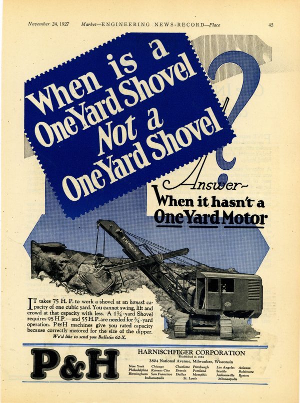 1927 P & H Model 700 Excavator Ad: Shovel, Crane, Dragline – Harnischfeger – Milwaukee, Wisconsin