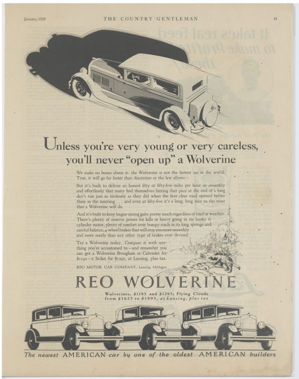 1928 REO Wolverine Collectible Automobile Advertisement: Brougham, Cabriolet, Sedan