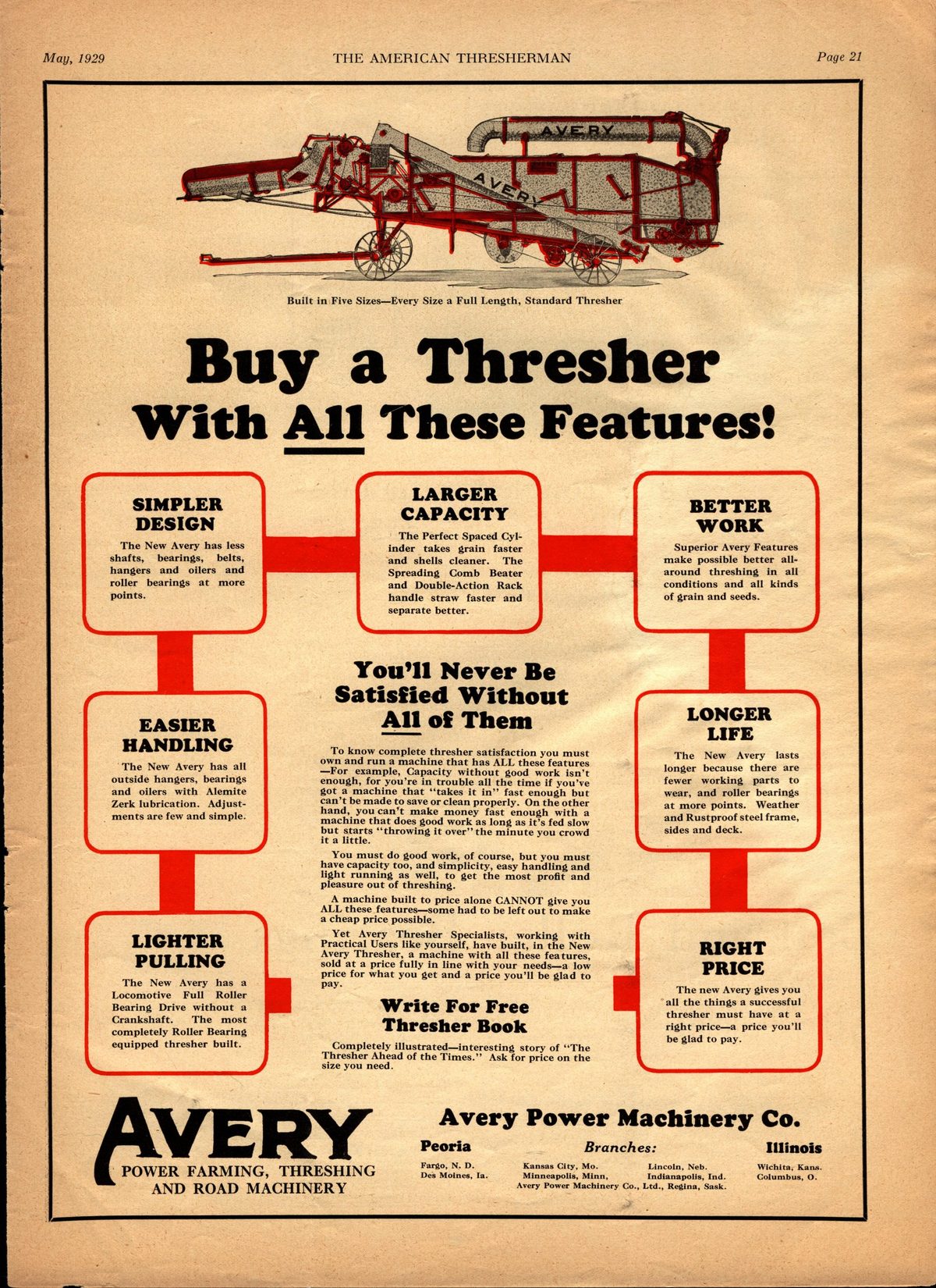 1929 Avery Power Machinery Company Collectible Threshing Machine Advertisement: Peoria, Illinois