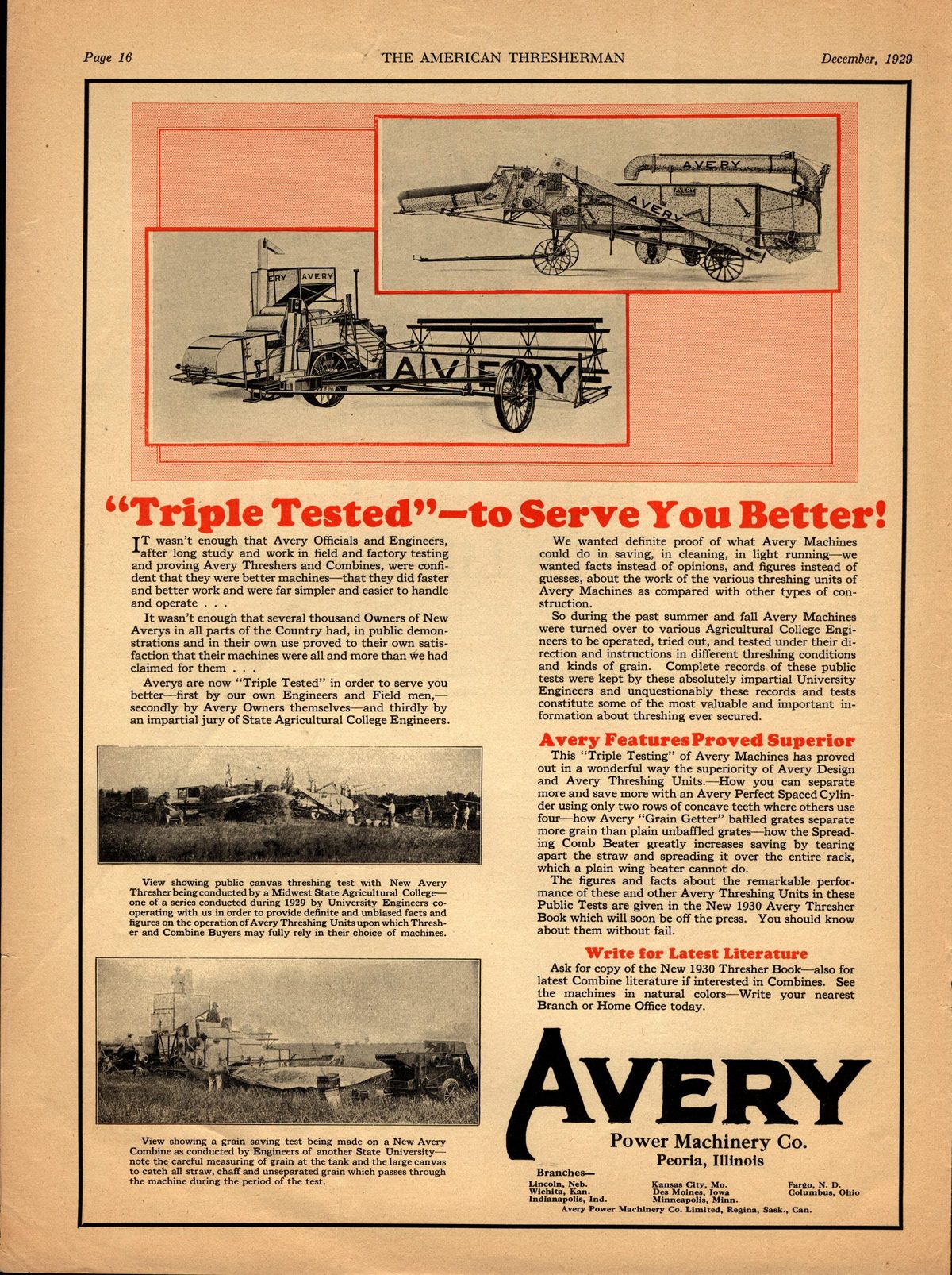 1929 Avery Power Machinery Company Combine & Threshing Machine Collectible Advertisement: Peoria, Illinois