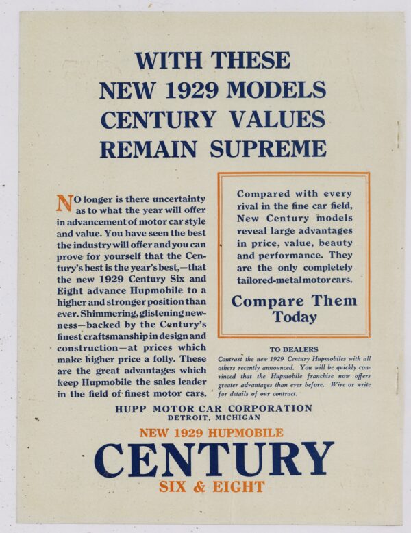 1929 Hupp Motor Company Collectible Advertisement: Hupmobile Century – Detroit, Michigan